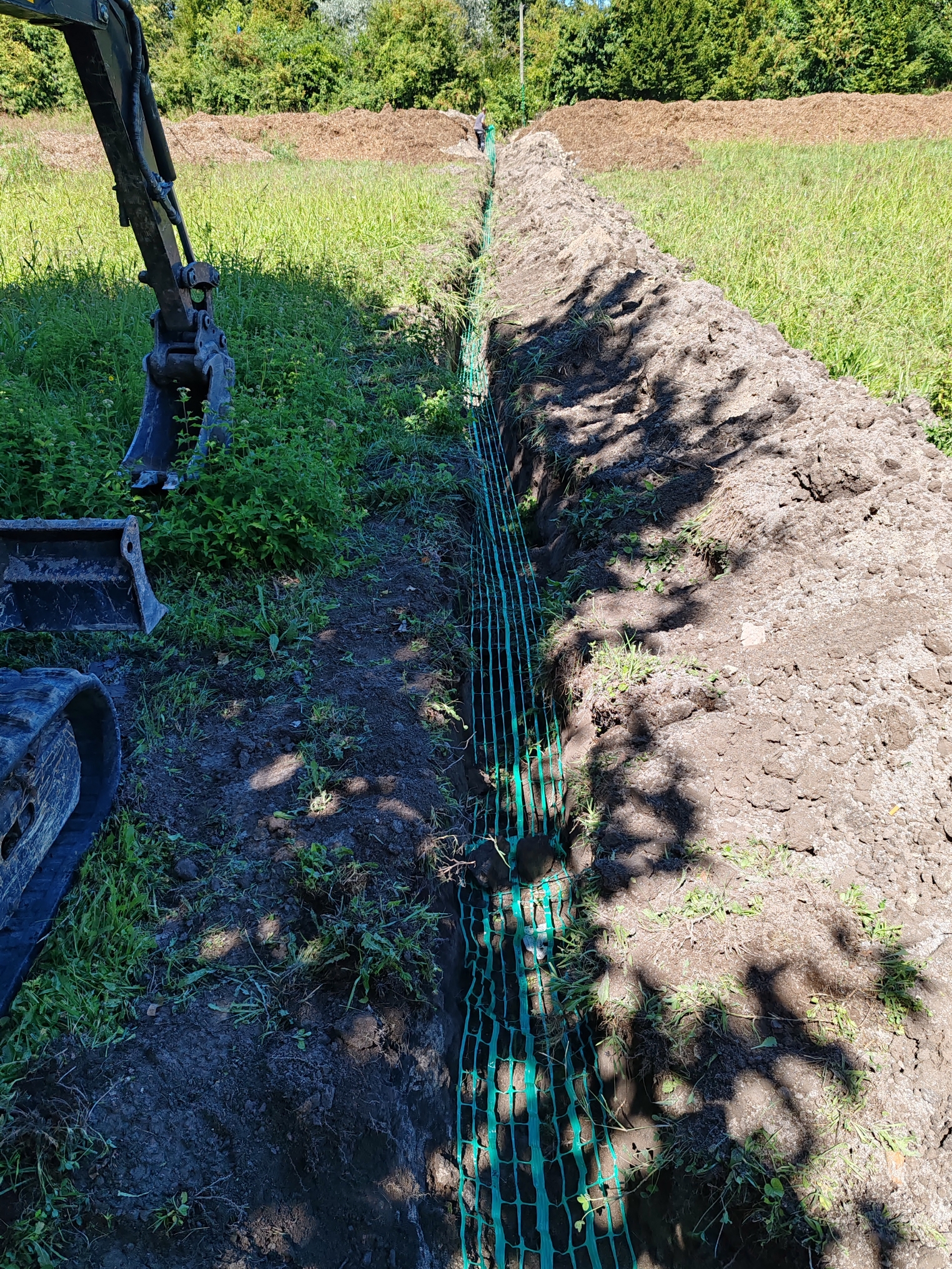 - Nous remblayons sur une vingtaine de centimètres et posons un grillage avertisseur vert. Il permet de prévenir qu’un réseau télécom se trouve sous terre lorsqu’un terrassier viendra creuser à cet endroit. Lorsqu’il découvrira ce grillage avertisseur il sera alerté et augmentera sa vigilance.
