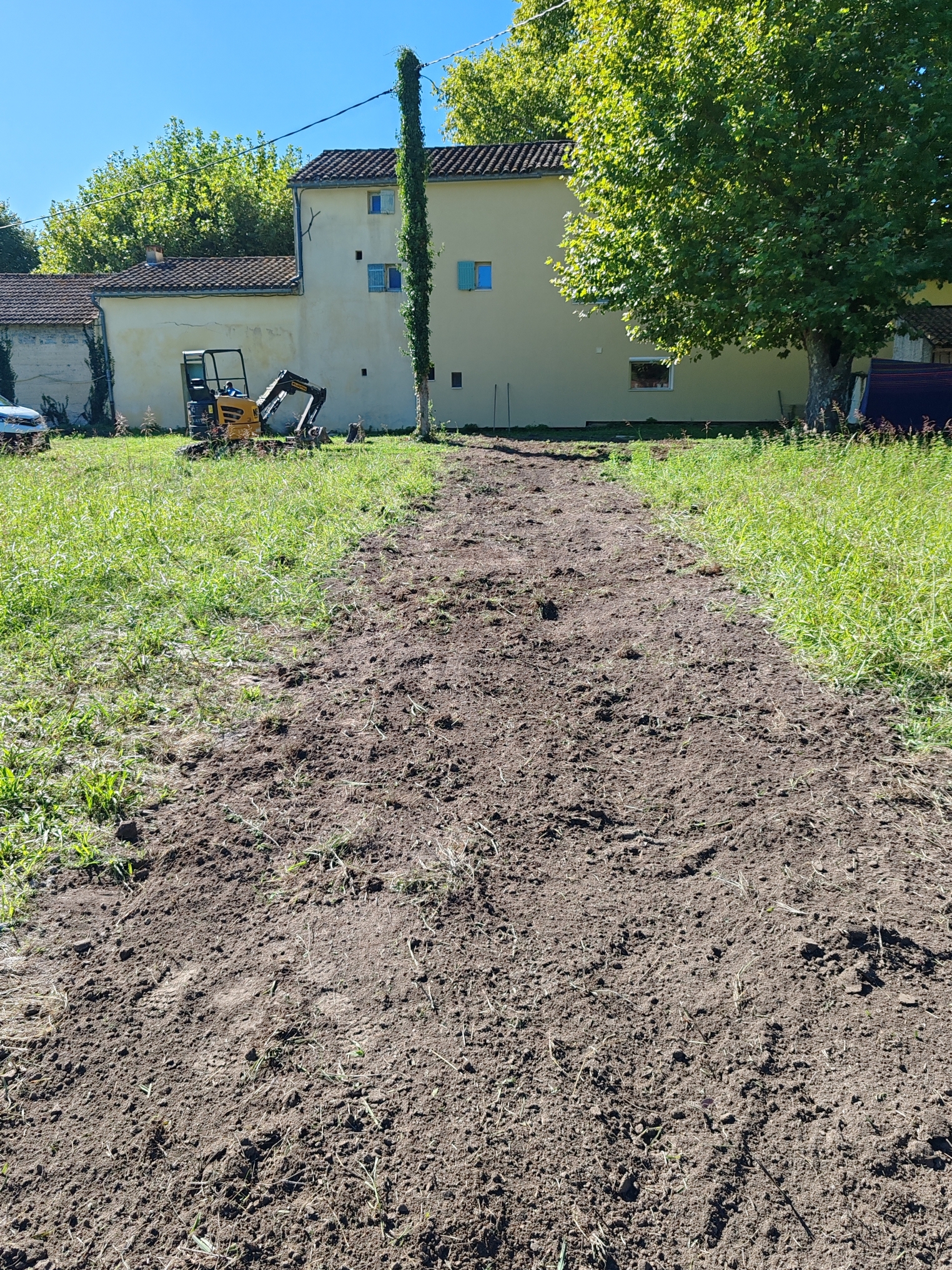 - Enfin nous remblayons entièrement la tranchée et damons afin de rendre l’espace plan et propre.